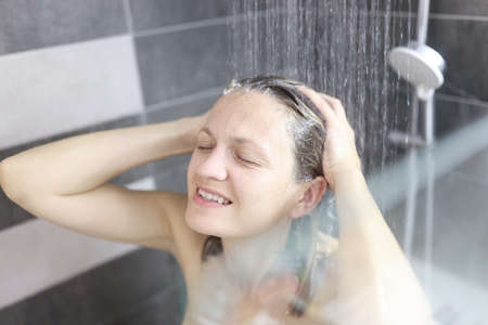 Blond Caucasian happy smiled female foaming hair and washing with shampoo in shower.