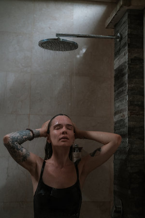 A young woman with wet hair and tattoos stands under a rain shower in a modern bathroom with tiled walls and a stone accent. The concept relaxation, hygiene, and self-care.