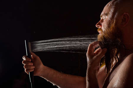 Male takes a shower. A brutal man with a red beard is standing in the bathroom under running water and washes. Spray scatter on a black background.