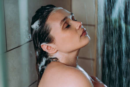 Close up of caucasian young woman taking a shower in the bathroom at home. Self-care, hygiene and relaxation concept