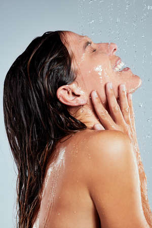Taking care of your skin is more important than covering it up. Studio shot of an unrecognisable woman taking a shower against a blue background.