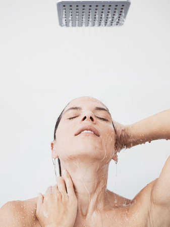 Woman takes hot shower in bathroom. Power and benefits of contrast shower concept