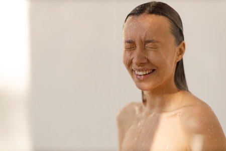 Young woman taking shower. Concept of simple pleasures, relaxing and healthcare