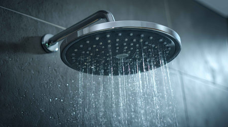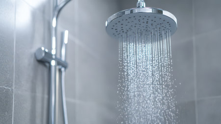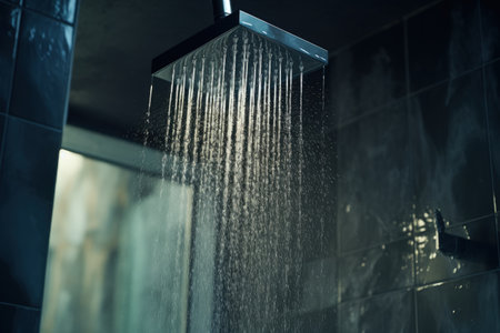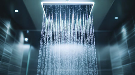This image captures water droplets cascading from a modern shower head in a stylish bathroom environment, creating a refreshing atmosphere and emphasizing cleanliness.