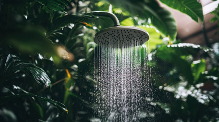 This image captures a showerhead pouring water in a vibrant tropical setting, surrounded by lush greenery. It evokes feelings of relaxation and rejuvenation.
