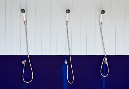 Outdoor shower head for the bath and showering cold water to body before jumping in the resort pool.