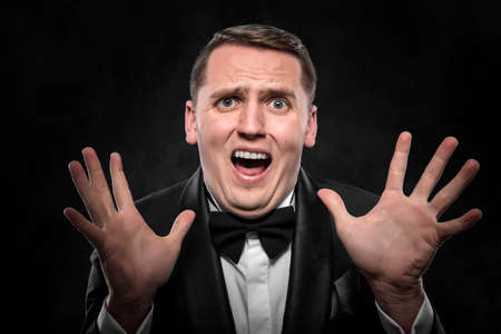 Excited or scared young man on a dark background.