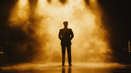The silhouette of a performer standing in a spotlight, with a smoky stage atmosphere adding depth to the scene.
