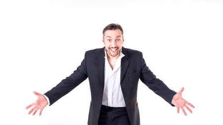 funny businessman about to hug you isolated on white