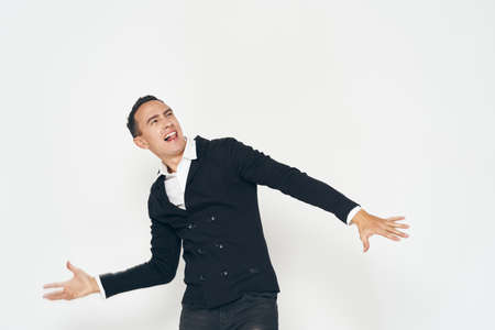 emotional man in black jacket fun isolated background