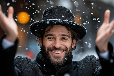 A captivating winter night scene showcasing a man in a red coat amidst falling snow, surrounded by festive lights and a joyful crowd celebrating the holiday spirit.