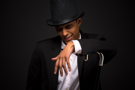 Handsome man in top hat posing with cane isolated on black background. Attractive man singing favourite songs in studio.