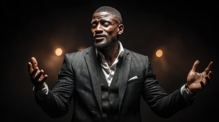 A man dressed in a formal suit performs passionately on stage, conveying deep emotions. The dim lighting enhances the mood, with soft highlights focusing on his expressive gestures.