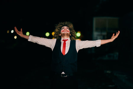 Creepy Clown Man in Vest and Red Tie Gesturing at Night Outdoors