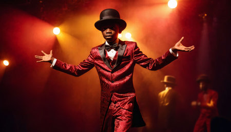Master of ceremonies in top hat leading circus performance with flair. Concept Circus Performance, Master of Ceremonies, Top Hat, Flair, Entertainment