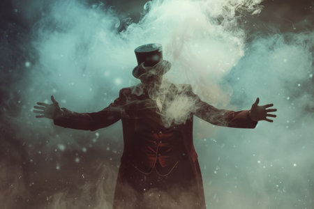 Enigmatic figure in formal attire, surrounded by vibrant red smoke, evokes a sense of wonder and mystery, enhancing the magical ambiance of the scene, AI generated