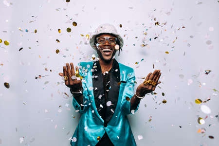 portrait of an hip hop music musician. Cinematic image of a man under confetti drop