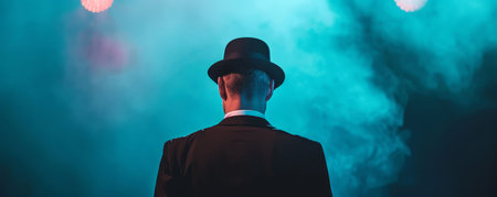 The back view of a male magician or illusionist in a suit and top hat, holding a magic wand on stage with dramatic backlit lighting, suggesting a moment of suspense before a magic trick is revealed
