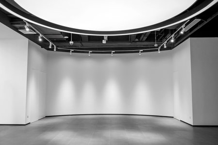 White empty gallery interior with spotlights. Black and white photo.