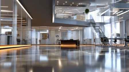 This image showcases a modern office interior featuring open spaces, large glass windows, and sleek furniture, ideal for inspiring creativity and productivity.