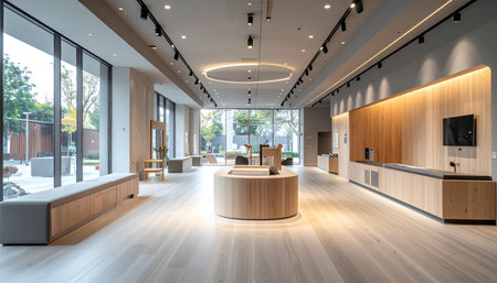 Sunlight streams through expansive windows into a pristine, modern lobby, illuminating the clean lines of the wooden architecture. This empty reception area awaits the days business, representing a space of quiet potential, professionalism, and corporate opportunity.