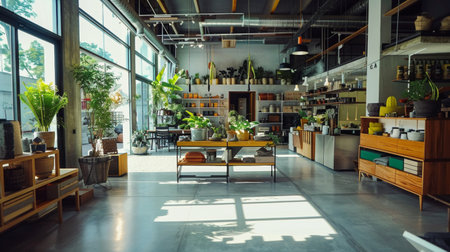 A modern indoor plant store filled with various green plants, basking in abundant natural light through large windows.