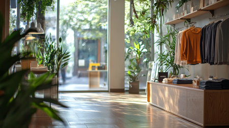 A cozy, modern store interior featuring clothing racks, lush green plants, and soft natural light streaming through large windows, creating a peaceful and inviting shopping experience.