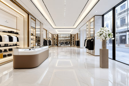 Modern luxury clothing store with elegant interior design featuring marble floor and white flowers