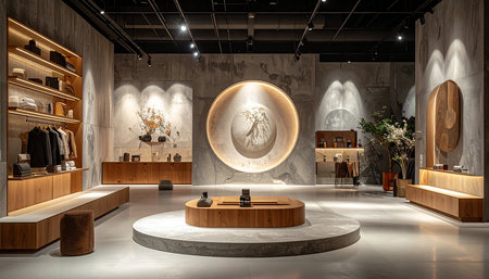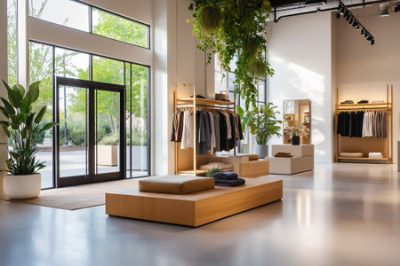 A modern retail space showcasing elegant fashion in a tranquil atmosphere. The stylish design features natural elements and inviting decor for an exceptional shopping experience.