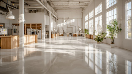 Luminous Industrial Warehouse with Glossy White Floors and Spotlights - High-shine epoxy flooring, smooth white walls, dramatic overhead lighting, a