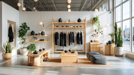 A stylish minimalist retail space showcasing contemporary clothing, featuring natural wood furniture, serene plants, and ample natural light, creating an inviting atmosphere.