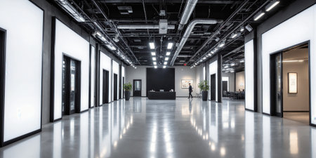Corporate Event Venue Interior Sophisticated industrial space with architectural lighting features and expansive polished floor. Exposed ceiling infrastructure creates visual