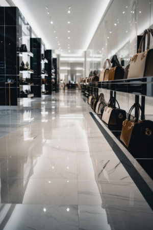 A row of handbags on display in a store. Generative AI image.