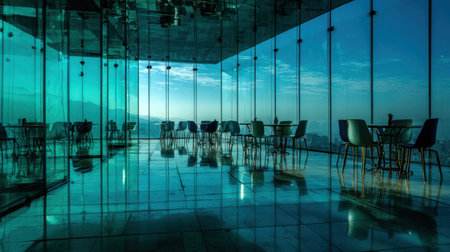 Experience the serene ambiance of a modern restaurant with glass walls, creating a stunning view of the city skyline, perfect for dining and relaxation.