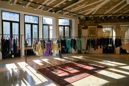 interior of modern fashion showroom with clothes hanging on hangers