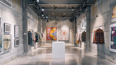 Modern industrial art gallery with raw concrete walls and polished floor. Features a contemporary exhibition of vibrant abstract art, textiles, and designer jackets on racks, illuminated by track lighting.