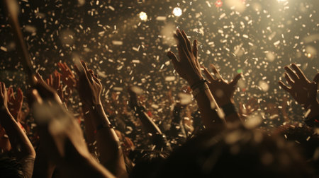 showing concert crowd cheering under a shower of gold confetti and dramatic stage lighting creating an energetic and celebratory atmosphere. resolution...