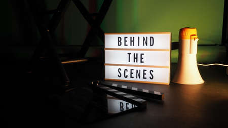 Behind the scenes letterboard text on Lightbox or Cinema Light box. Movie clapperboard megaphone and director chair beside. Background LED color change. static camera in video production studio.