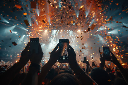 Audience capturing live concert moments on their smartphones at night, with colorful stage lights and bokeh atmosphere.