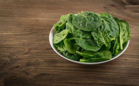 Fresh leaves of baby spinach in white bowl on wooden table.