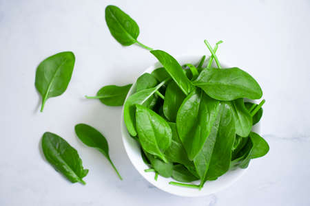 Young green spinach leaves on a white background, top view, copy space. Clean food, detox, diet food ingredient - green organic spinach