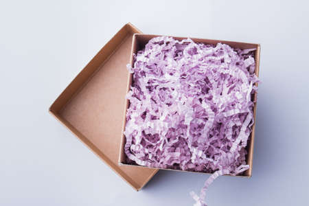 White shredded paper in a carboard box.