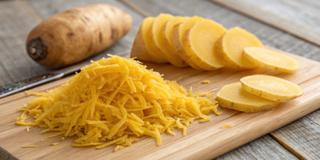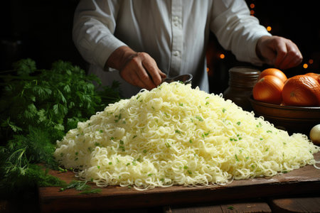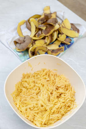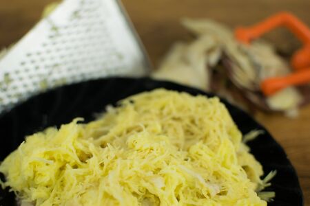 Grated apple on a cutting board with selective focus. Preparation for making pies with apple filling. Cooking at home concept. Tradition home-made food