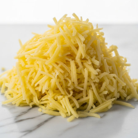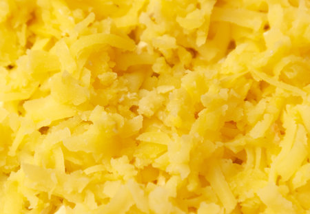 A large mound of yellow food with a generous amount of cheese sprinkled on top. The food appears to be a type of potato dish, possibly a potato salad or mashed potatoes