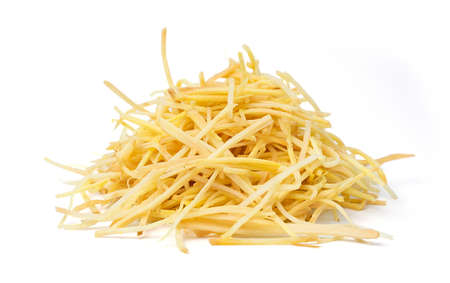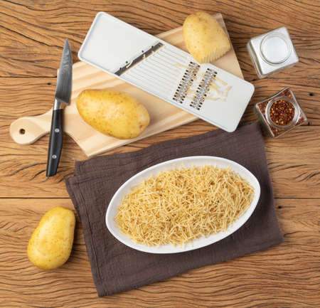 Potato straw or shoestring potato in a white plate with raw potatoes.