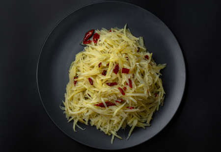 Different cuts of potatoes on a black textured background. Photo taken from above