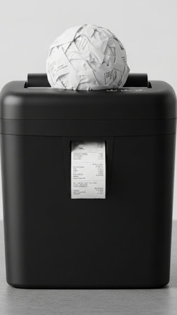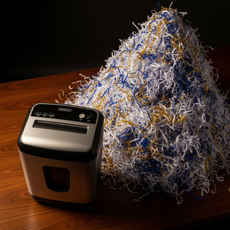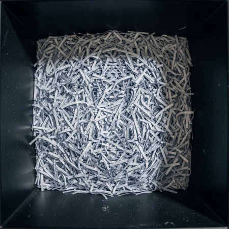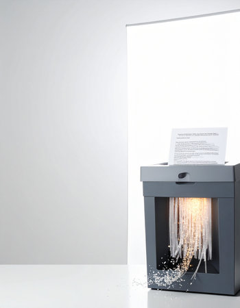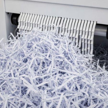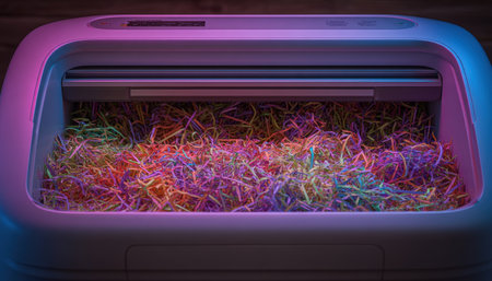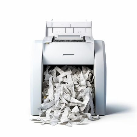 An office paper shredder works tirelessly, transforming sensitive documents into a pile of indecipherable strips.