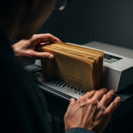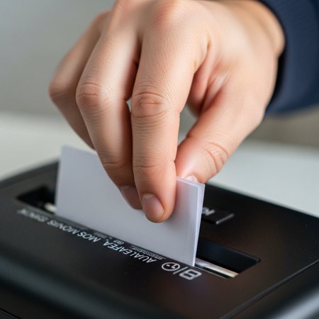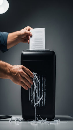 An editorial, candid photograph capturing the process of destroying outdated and sensitive financial