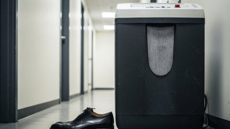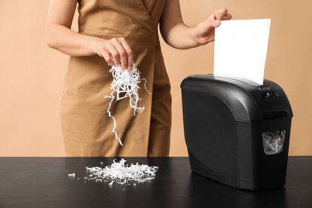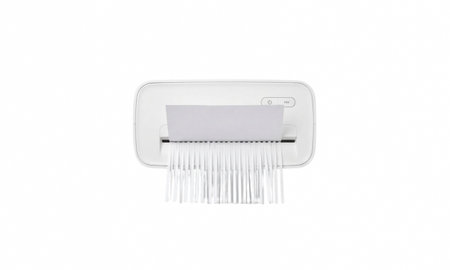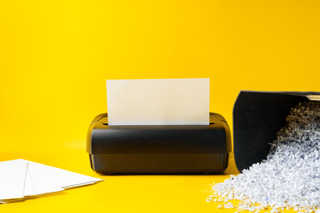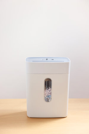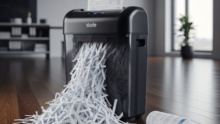 In a clean, modern office, a paper shredder diligently works to destroy sensitive information.