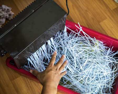 Shredding paper coming out from the machine. Top view. Shredding documents for security.